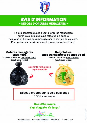Pour rappel : les déchets sont à sortir la veille au soir, à partir de 19h, sur le trottoir.