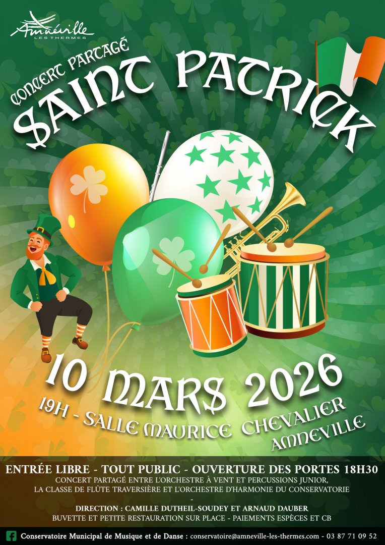 Le conservatoire de musique et de danse d'Amnéville lance les invitations au « concert partagé de la Saint Patrick » le mardi 10 mars 2026 à la salle Maurice Chevalier